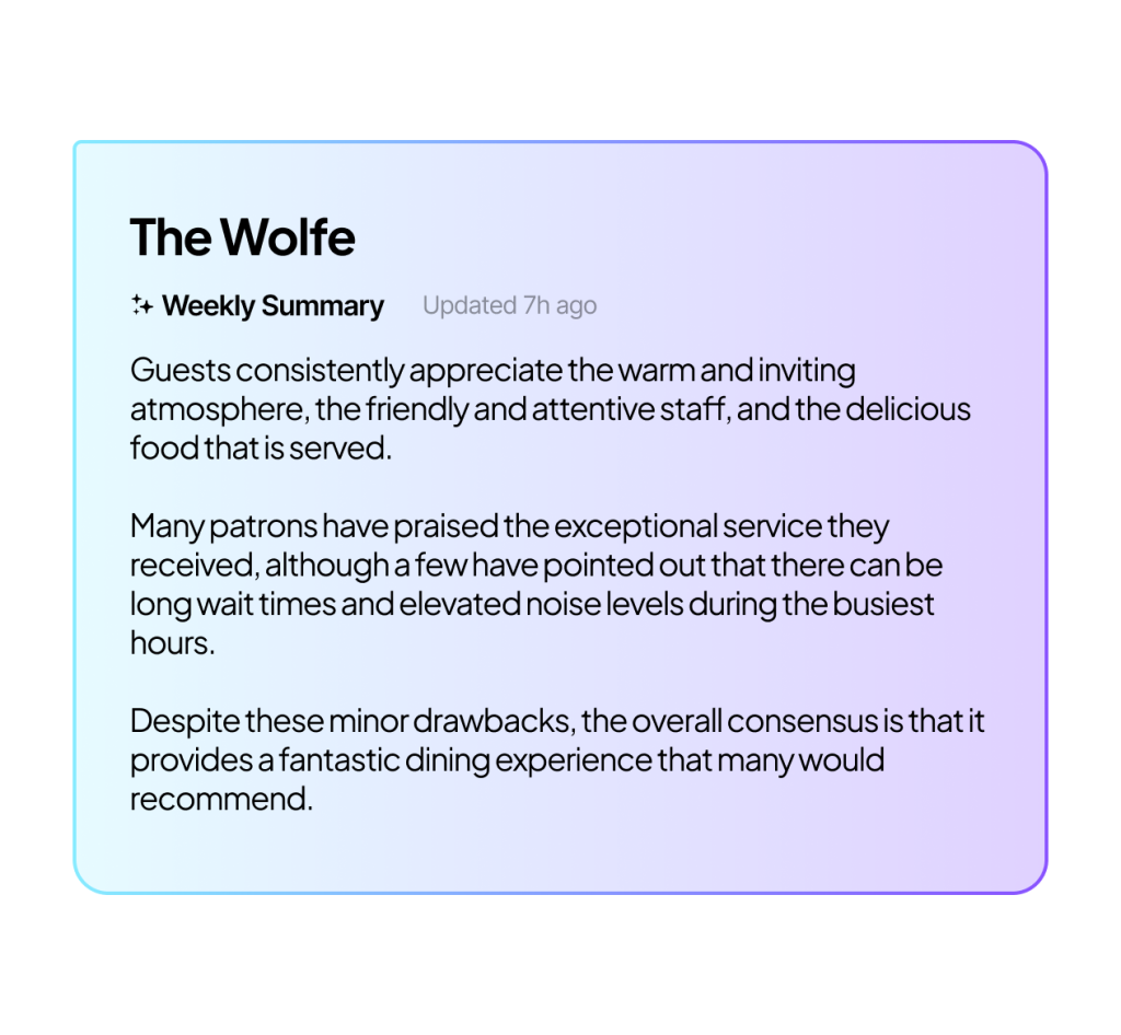 Skip the data overload. Twocents automatically organizes and summarizes your feedback so you instantly see what’s working — and what’s not. Save time and spot trends before they become reputation risks.