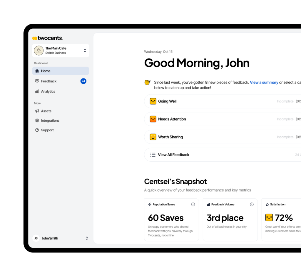 Twocents helps businesses collect honest feedback, recover unhappy customers, and turn great experiences into stronger reviews — all in one simple platform.