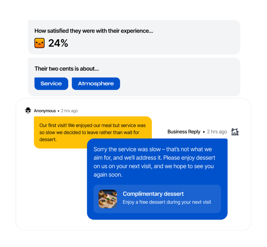 Most customers want to be helpful — not leave public complaints. Twocents gives you a private way to hear from more customers, recover unhappy ones, and strengthen your reputation.